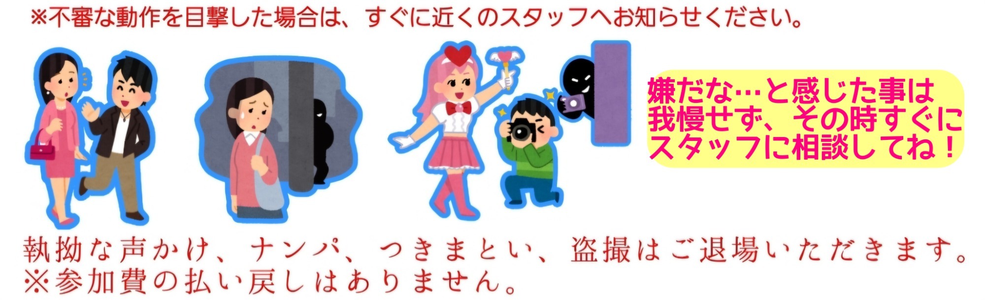 ・イベントに関係のないトラブル(例:一般の方同士で喧嘩を始めたなど)は対応できません。